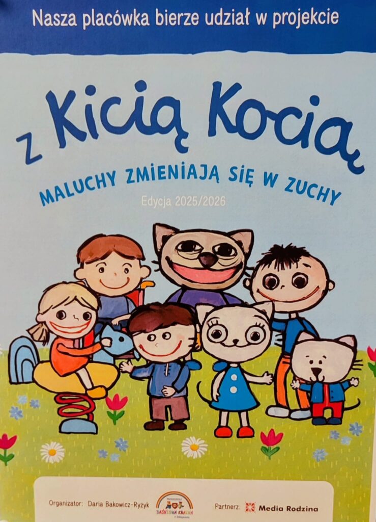 Nasze przedszkole bierze udział w ogólnopolskim projekcie „Z Kicią Kocią maluchy zmieniają się w zuchy”. Jest to inicjatywa edukacyjna oparta na serii książek Anity Głowińskiej, skierowana do najmłodszych przedszkolaków. Jego głównymi celami są promowanie czytelnictwa, rozwijanie potencjału poznawczego oraz łagodna adaptacja dzieci do przedszkola poprzez utożsamianie się z bohaterami książek. W ramach projektu realizujemy różnorodne zadania i aktywności oparte na treści książek.